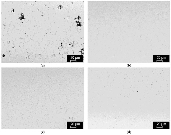 To find suitable conditions for proper sintering, a range of temperatures was used for each powder. Figure 1 shows the porosity dependence on sintering temperature. Expectedly, the porosity decreases with increasing temperature. In addition, for finer powders, the temperature needed to achieve nearly full density decreased from ~2100 °C for the −20 μm powder to ~1500 °C for the 0.4 μm powder. This agrees reasonably with the study by Autissier et al., where densities above 95% were achieved at 1900 °C for 5–10 μm powder [20]. Cross-section observation of the non-fully sintered compacts (Figure 2) revealed that the porosity is concentrated close to the sample surfaces, while the central region is much denser. This was confirmed by image analysis in the central regions of the respective samples (Figure 1b) showing significantly lower porosity values. Nevertheless, sintering conditions leading to nearly full density are important, and the corresponding temperature range was determined from the Archimedean porosity data.