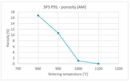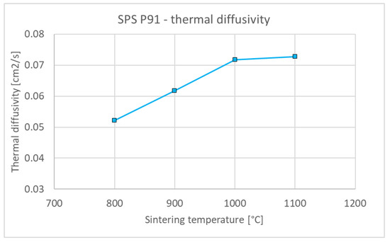Figure 6 shows representative microstructures of the steel compacts sintered at 800–1100 °C. Significant densification can be seen already at 800 °C, while the boundaries of the original particles are discernible up to 1000 °C. At 1100 °C, steel is practically fully sintered, with only a minute amount of residual porosity. Similarly as with tungsten, the porosity monotonously decreases with the sintering temperature (Figure 7) and, correspondingly, thermal diffusivity increases (Figure 8). It is worth noting that the thermal diffusivity of steel is roughly one order of magnitude lower than that of tungsten. This bears important consequences for the design and performance of plasma facing components made with this material combination—in contrast to those made of tungsten and copper [28] whose thermal conductivity is more than twice that of tungsten. Since the steel sinters fully at much lower temperatures than tungsten, no extensive variation of the conditions, as performed for tungsten, was deemed necessary.