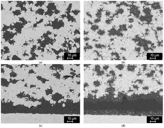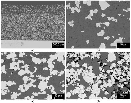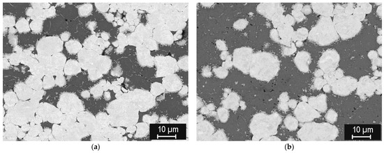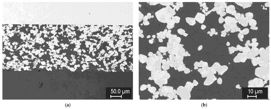 The formation of well-sintered, dense composites at this temperature can be seen. In addition, a thin layer of intermetallic (medium-grey phase) was formed on the tungsten/steel boundaries, due to mutual interdiffusion at the elevated temperature. Strings of fine intermetallic particles can occasionally be seen in the steel phase, likely at the former steel particle boundaries. In the 25% W composite (Figure 9c), thick diffusion regions in the steel phase, without sharp boundaries, can be seen, indicating W-enriched areas around the W particles. In the 50% W and 75% W composites, such regions extend over the entire steel phase, due to shorter distances between the W particles. Figure 9d shows a microstructure of the same 25% W composite, closer to the sample surface. Here, the intermetallic layer is significantly thicker, illustrating that the interdiffusion may be affected by local variations in the current density and temperature during sintering.