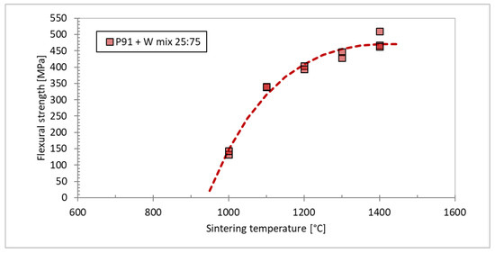 To study the effect of the sintering temperature on the degree of mutual bonding and the intermetallic formation, sintering temperatures in the range of 1000 °C to 1400 °C were used, see Figure 10. One can see that the composites formed at 1100 °C or above are dense, while the intermetallic content progressively increases with the temperature, until at 1400 °C it represents the dominant phase. Cracks can be seen in the intermetallic (Figure 10d,e), spanning the entire thickness between W particles, testifying to its brittle nature. At 1000 °C, its formation can be avoided; however, such conditions lead to only partial sintering with rather high porosity. In [29], the properties of the individual phases in these composites were investigated. The intermetallic phase was identified by X-ray diffraction as having a Fe7W6 structure. It was found to have significantly higher hardness and yield strength than tungsten, and a thermal conductivity slightly lower than P91 steel. Here, the effects on the overall mechanical properties will be presented. Figure 11 shows the flexural strength of the composites from Figure 10, determined by 3-point bending. A gradual increase of flexural strength with the sintering temperature can be seen. This can be attributed to the improved bonding of the particles. The intermetallic content (expectedly) increases with temperature; one can conclude that—despite its brittle nature—it does not undermine the overall strength of the composite.