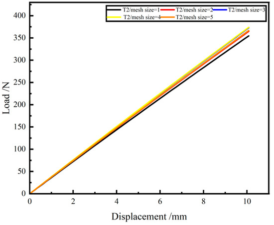 The difference between the simulation results with different mesh sizes does not exceed 5.5%, so the effect of the mesh size on the simulation stiffness is not significant. Generally, the smaller the mesh size, the closer the simulation results are to the actual situation, but considering the simulation time, the mesh size cannot be reduced indefinitely. Therefore, the mesh size of 1 mm is used to simulate the GFRP wave springs.