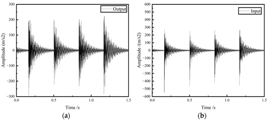 After completing the frequency response experiment, the time domain signal measured by the acceleration sensor was read in the B&K connect software to obtain the vibration response curve of the GFRP wave springs. The input and output signals are shown in Figure 12.