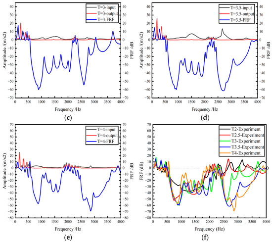 Frequency domain signals of GFRP wave springs and its FRF curve, (a) T = 2, (b) T = 2.5, (c) T = 3, (d) T = 3.5, (e) T = 2, (f) the FRF curve of GFRP wave spring with different period.