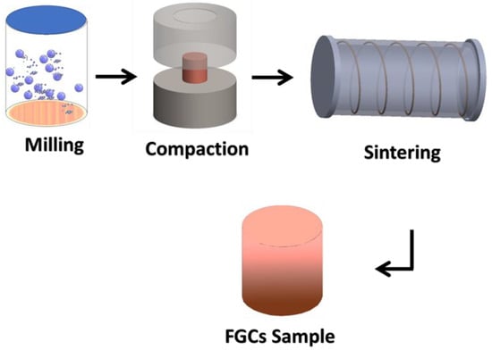 In order to sinter the prepared layers of FGC powders, they were first pressed by a hydraulic press using a load of 30 MPa, laying one layer next to the other, each layer having a thickness of 5 mm and a radius of 7.5 mm. After that, they were sintered at a temperature of 550 °C in argon gas for 2 h and a heating rate of 5 °C/min. The schematic diagram represents the steps for FGCs and the different layers prepared to obtain FGCs, as shown in Figure 1 and Figure 2, respectively.