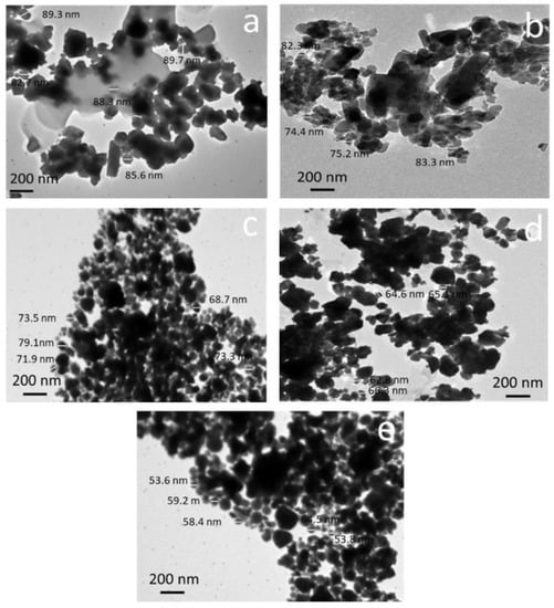 TEM images of layers FGC-0, FGC-1, FGC-2, FGC-3, and FGC-4 powders of FGCs after 20 h of milling are shown in Figure 4. As predicted, the FGC-0 (Mg-Li-Al alloy matrix) particles are deformed during milling. In contrast, the silica fume reinforcement particles are fragmented. Accordingly, for FGC-1, FGC-2, FGC-3, and FGC-4, the presence of silica fume is responsible for the observed reduction in particle sizes of the Mg alloy, as seen in the image. The presence of hard silica fume reinforcement lowers cold welding and speeds up the fracture process during milling, which explains the reduction in particle sizes. Furthermore, the reinforcement particles can insert between particles of the Mg alloy matrix, reducing their plastic deformability and making them more brittle, increasing the chances of fracture [41]. After milling, as seen in Figure 5, the main particle size value for FGC-0 is 85.6 nm. However, the main particle size values for FGC-1, FGC-2, FGC-3, and FGC-4 are 78.8, 73.1, 64.7, and 57.9 nm, respectively.
