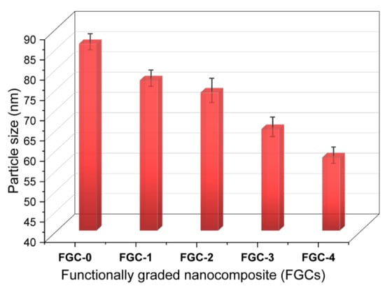 Particle sizes of FGC-0, FGC-1, FGC-2, FGC-3, and FGC-4 nanopowders after 20 h of grinding.