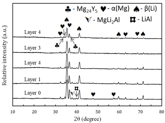 - The particle sizes of the layers were reduced with the addition of hybrid reinforcement. The addition of a rare earth element, i.e., Y, also led to the formation of the intermetallic compound, i.e., the Mg24Y5 phase, in addition to the presence of the MgAlLi2 and Al–Li phases bound to the Mg alloy;