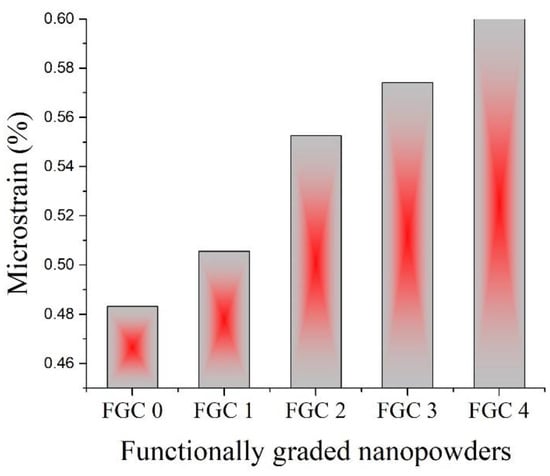 Figure 6 shows the XRD patterns of the various milled layers of FGCs. It is evident from the XRD pattern of FGC-0 (alloy matrix) that it is mainly composed of a dual structure of α-Mg and β-Li phases. The α-Mg phase is present as identified from the XRD peaks at 2θ = 36.62°, 34.4°, 68.65°, 63.07°, 32.19°, and 47.82°, while the XRD peaks confirm the β-Li phase at 2θ = 35.39, 41.1, 59.53, and 71.2° according to the ICCD file cards 89-5003 and 89-4087, respectively. It is also clear that the intermetallic MgAlLi2 and Al–Li precipitated phases are confirmed by the presence of peaks located at 2θ = 38.51° and 44.76° according to the ICCD file cards 08-0283 and 71-0362, respectively. It should be noted that the gradually increasing weight percentage of Y, the Mg24Y5 intermetallic compound, is detected in FGC-3 and FGC-4 only. This observation can be expected from the general reader due to the lower weight percentage of Y in FGC-1 and FGC-2; therefore, the characteristic XRD peaks of this phase do not appear in the chart because they are below the detection limit of the XRD instrument. It can also be assumed that a steady increase in silica dust concentration leads to a noticeable decrease in the intensity and increases the full width at half the maximum of the peaks, causing the increase in micro-strain, as shown in Figure 7. They show an increase in width due to the hard reinforcing particles, which act as grinding balls and can cause a higher energy transfer to the Mg alloy matrix [28,43].