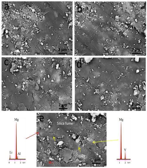 SEM images of all layers of FGCs are shown in Figure 8. It is evident from the figure that all layers exhibit excellent densification behavior, as indicated by the compact structure that appears and the almost complete absence of pores. This compaction can be attributed to the strong bonding between the Mg alloy particle matrix phases and considerable grain growth. Noteworthy, FGC-4 shows little porosity due to the higher weight percentage of the hybrid reinforcement, which helps to raise weak interfacial bonding between the Mg alloy and silica fume and reduce grain growth. Another important observation that can be seen in this figure is the homogeneous distribution of silica fume in addition to Mg24Y5 and MgLi2Al phases, which contribute to the improvement of the mechanical and wear rate of the FGCs layers, as will be discussed in the following sections. EDX was carried out to clarify the elemental analysis of the phases formed in the FGC-4 sample, namely Mg24Y5 and MgLi2Al. The silica foam is demonstrated as a white arrow in Figure 8e, while Li and Y elements appear as red and yellow color arrows, respectively.