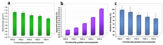 (a) Bulk density, (b) apparent porosity, and (c) relative density of FGCs sintered at 560 °C for 1 h in argon.