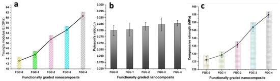 (a) Young’s modulus, (b) Poisson’s ratio as a representative of the elastic moduli, and (c) Compressive strength measured by non-destructive ultrasonic technique for all FGCs.