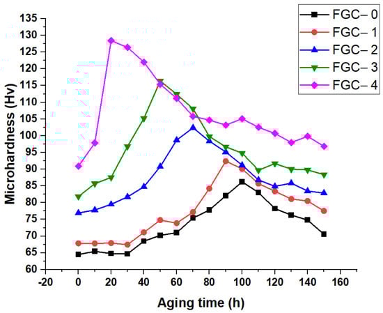 The effect of Y and silica fume particles on the hardening behavior of FGCs aged at 180 °C is illustrated in Figure 13. Generally, the microhardness of various layers based on Mg alloy rises as the aging time goes on (hardening process). The aging curves then show a “softening point,” a turning point for alloy hardness (microhardness reduces with aging time after this point). It is known that the MgAlLi2 is a strengthening phase while the Al–Li is a softening phase. The precipitation of the MgAlLi2 and Mg24Y5 phases causes age hardening. The interaction between the precipitate and the dislocation, which generally includes the Orowan by passing and shearing mechanisms, causes precipitation intensification. Since MgAlLi2 is a metastable phase, it decomposes to the Al–Li phase during the further aging process. Furthermore, the time required to reach maximum microhardness, with the increase in microhardness value, decreases significantly with increasing hybrid reinforcement of the different layers. As the number of matrix-reinforcement interfaces and the amount of reinforcement increase, the aging kinetics of the coatings made of FGCs accelerate. For further clarification, one can note that in the case of FGC-1, age-hardening happens early in the aging process (within 5 h), followed by age-softening. As for FGC-1, 2, 3, and FGC-4, age-hardening occurs in 5, 4, 3, and 1 h, respectively, and then softens with aging. The results show that the hardness increases with increasing aging time until it reaches its maximum at 100 h and then decreases. This aging behavior is due to the formation of the Mg Li2Al precipitation phase during the alloy’s preparation.