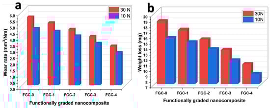 Figure 14 illustrates the effect of different hybrid reinforcements on the weight loss and wear rate of FGCs layers at applied loads of 10 and 30 N. The results point out that the wear rate and weight loss of FGCs decreased with an increase in the hybrid reinforcement’s contents and increased with an increase in the applied load. It is interesting to see from the figure that an increase in the applied load during sliding wear tests is responsible for considerable increases in the weight loss and wear rate of all FGCs [53,54]. For example, the weight loss of FGCs from 0 to 4 when the applied load is 10 N is 15.37, 14.61, 13.34, 11.30, and 8.80 mg, respectively. The values of layer 1 wear rate at applied loads, i.e., 10 and 30 N, are 4.61 and 5.54 mm3/Nm, respectively, while the values of FGC-4 wear rate are 2.64 and 3.18 mm3/Nm, respectively. In other words, the latter layer’s weight loss and wear rate are reduced by about 11 and 33% compared to the non-reinforced layer Equation (11):