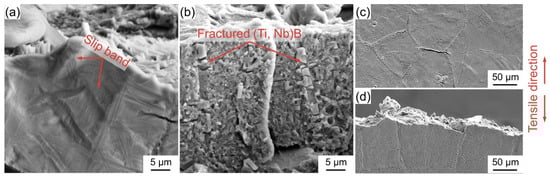- When the (Ti, Nb)B content reached a reasonable range, the yield strength of the composites improved and the ductility exhibited an opposite trend with the increase in the volume fraction of reinforcement. The (Ti, Nb)B incorporation inhibited the strength weakening of the PPBs area at high temperatures, which significantly increased the strength of the composites.