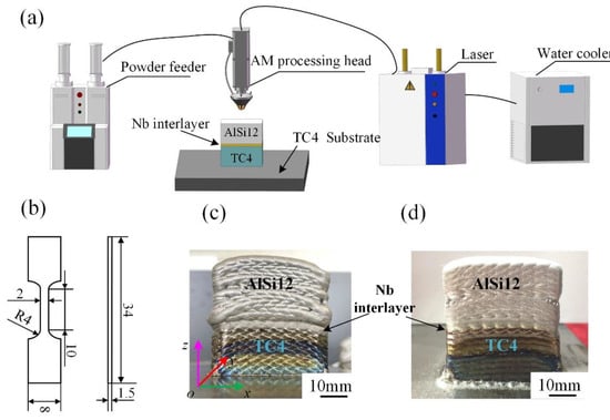 The TC4/AlSi12 BS were performed on the LDM8060 system developed by Nanjing Zhongke Raycham Laser Technology Co., Ltd., (Nanjing, China), as shown in Figure 1a. The LAM experiment was carried out in an argon atmosphere and the oxygen and steam content in the inert gas chamber was strictly controlled below 20 ppm. The deposition sequence of TC4/AlSi12 BS was to first deposit a TC4 cuboid with a size of about 40 × 25 × 20 mm on the TC4 substrate. -Secondly, a layer of Nb was deposited on top of the TC4 deposit. An AlSi12 cuboid of about 40 × 25 × 20 mm was then deposited on the Nb interlayer, and finally BS with a total size of about 40 × 25 × 40 mm was deposited, as shown in Figure 1a. The process parameters for samples 1 and 2 are shown in Table 2, which were obtained on the basis of extensive preliminary experiments []. The physical photos of the samples are shown in Figure 1c,d; compared with sample 1, the reduction of laser power during the deposition of AlSi12 in sample 2 leads to a significant alleviation of its collapse, resulting in a flatter and smoother surface and sides.