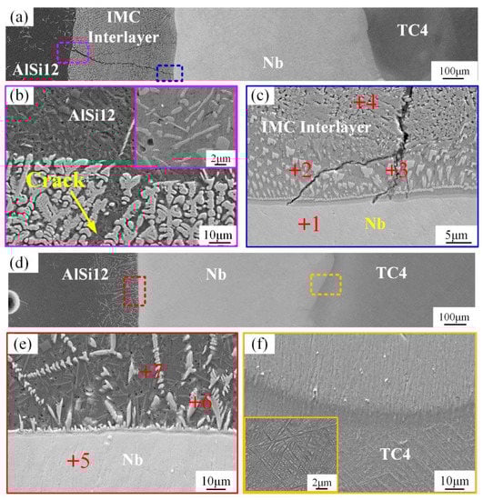 (a). cross-section of sample 1, (b). IMC/AlSi12 interface of sample 1, (c). Nb/IMC interface of sample 1, (d). cross-section of sample 2, (e). Nb/AlSi12 interface of sample 2, (f). TC4/Nb interface of sample 2.