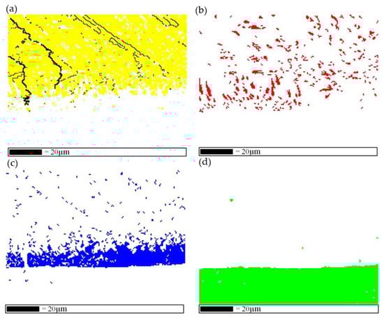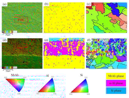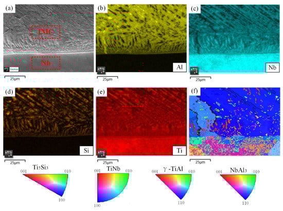 The elemental distribution, phase composition and crystallographic information in sample 1 were further investigated using EBSD. As can be seen from the analysis results in Figure 3, Ti and Nb elements diffused in the entire region near the Nb/IMC interface, while the Al and Si elements separated in the upper region of the Nb/IMC interface. The massive Al-poor region was formed nearly 10 μm from the Nb/IMC interface, corresponding to the position of point 3 in Figure 2c. The EBSD phase scanning analysis (Figure 4) confirmed that the lower part of Nb/IMC interface was mainly composed of (Ti, Nb) solid solution and the Al-poor region was Ti5Si3 phase. The (Ti,Nb) solid solution solidified in the Nb region of sample 1 was melted by the larger AlSi12 deposition power. As a result, a large number of Ti, Nb, Al and Si atoms entered the molten pool simultaneously. In addition to Ti5Si3, γ-TiAl phase and NbAl3 phase, corresponding to points 2 and 4 in Figure 2c, were also formed in the upper part of Nb/IMC interface by the diffusion and migration between different atoms. The NbAl3, γ-TiAl and Ti5Si3 phases all contained either Ti atoms or Nb atoms at the same time (Table 3). This was because the atomic size and crystal structure of Ti and Nb are similar, resulting in the situation that Ti-Nb atoms occupied each other’s atomic positions in each phase []. The difference was that the content of occupying atoms was slightly different, but the basic lattice morphology of the phases was still maintained. Due to the existence of various compound phases, the structure of the deposited layer in sample 1 varied greatly, and it was easy to cause stress concentration and cracking under the action of cyclic thermal stress. In addition, the NbAl3 grains near the Nb/IMC interface were relatively coarse and had the same crystal orientation (growing along the (110) direction), as shown in Figure 3f. This morphology of the NbAl3 phase does not have enough anisotropic grain boundaries to hinder crack propagation. After crack generation, it extended along the IMC layer until the Nb/IMC interface. Finally, the initial crack was filled and healed by aluminum alloys with low melting point and good fluidity, while the distal part of the crack was not.
