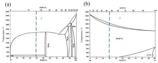 Equilibrium diagram of binary alloys, (a). Al-Nb, (b). Nb-Ti.