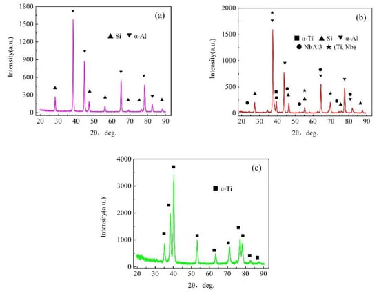 The XRD diffraction analysis results of the TC4 region, Nb region and AlSi12 region of sample 2 are shown in Figure 7. Combined with the EDS point scanning component analysis results in Table 3, it can be determined that the basket-like structure of the TC4 region was mainly composed of α-Ti, and β-Ti (the lower content made the diffraction peak not obvious) was present in the (α + β) organization. The AlSi12 region exhibited typical Al-Si eutectic characteristics accompanied by the massive primary Si phase. This is consistent with the research results of scholars Cheng et al. [] and Gao et al. [], respectively. The Nb region was mainly composed of (Ti, Nb) solid solution, and the white precipitate near the Nb/AlSi12 interface (as shown in Figure 2e) was NbAl3 IMC.