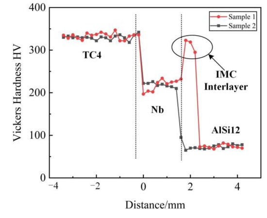 The microhardness distributions of the cross-sections of sample 1 and sample 2 are shown in Figure 8. As can be seen from the figure, there was no significant difference in the hardness of the TC4 region (about 340 Hvx) or the AlSi12 region (about 85 Hvx) in both samples, showing the highest and lowest hardness, respectively. A gradient transition with a hardness of about 200~220 Hvx was formed between the TC4 region and the AlSi12 region. Obviously, the formation of (Ti, Nb) solid solution in the Nb region not only effectively hinders the interaction between TC4 and AlSi12 to form the high-hard Ti-Al phases, but also effectively alleviates the hardness difference between the two regions. The hardness of sample 2 gradually decreased from the TC4 region to the AlSi12 region, while sample 1 fluctuated between the Nb region and the AlSi12 region. This was due to the generation of a relatively hard and brittle NbAl3 IMC layer in this region, resulting in hardness exhibiting the second highest value of about 300 Hvx. The microhardness analysis results show that the Nb interlayer could obtain a good plastic transition from TC4 to AlSi12 under proper heat input control.