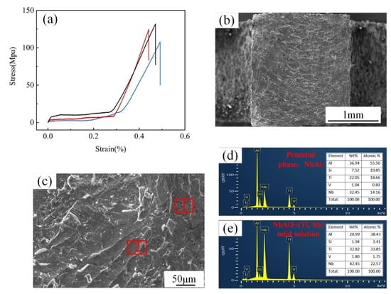 Three samples were prepared on sample 2 for the room temperature tensile test, and the tensile stress-strain curve was shown in Figure 9a. The experimental results showed that the tensile specimen fractured abruptly without a significant yielding with an average tensile strength of 128 MPa. The results indicate that TC4/AlSi12 BS with an Nb interlayer can obtain an acceptable tensile property under appropriate process parameters. The tensile fracture surface demonstrated mainly cleavage steps, showing the characteristics of quasi-cleavage fracture, as shown in Figure 9b,c. In order to determine the fracture position, an EDS point scanning analysis was performed on the fracture surface at point 1 and point 2 of the tensile sample in Figure 9c. It can be seen that the possible phases of the fracture were NbAl3 (Figure 9d) and (Ti, Nb) solid solutions (Figure 9e), indicating that the specific fracture location should be located near the Nb/AlSi12 interface of sample 2.