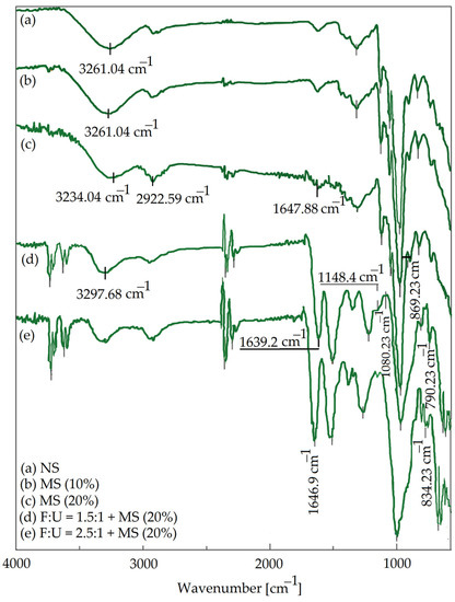 The presence of a band at 3200–3300 cm−1 in all samples is attributed to OH stretching vibrations. For native starch, the characteristic bands were mainly observed at 2922 cm−1, 1650 cm−1, 1364 cm−1, 1149 cm−1, and 1075 cm−1. The bands at 2922 cm−1 and 1364 cm−1 originated from C-H stretching vibrations of methylene (−CH2) groups [30]. The band at 1650 cm−1 is assigned to C-O bending vibrations associated with hydroxyl groups. The stretching vibrations of asymmetric C-O-C and C-O functional groups would cause the absorption bands at 1149 cm−1 and 1075 cm−1, respectively [31,32]. Based on previous reports, the carboxyl and aldehyde groups for oxidized starch appeared in the 1650–1735 cm−1 range [33]. For oxidized starch (b and c spectra), the band at 1650 cm−1 became stronger and it was also shifted to a lower wavenumber, confirming the formation of more aldehyde groups during the oxidation process. The symmetric stretching band of carboxyl groups (−COO) arising from oxidized starch might overlap with the band belonging to C-O bending vibrations of native starch, which resulted in band broadening. The band at ~3260 cm−1 was strengthened and widened, which was assigned to the formation of free hydroxyl groups as a result of chain scission in the oxidative process. The band’s broadening at 2922 cm−1 after oxidation is related to chain scission, which further evidenced the successful oxidation of starch [34]. For the UF/MS adhesive (c and d spectra), the appearance of two bands at 1470 cm−1 and 1150 cm−1 are attributed to the stretching vibration of the N-H group and the deformation vibration of the C-H group, respectively. This finding verified the transformation of oxidized starch and UF into adhesive resin via a polycondensation reaction [35]. Furthermore, the bands at ~3300 cm−1 and 2920 cm−1 belonging to O-H and C-H stretching vibrations were weakened, which confirmed the generation of polycondensation and partial intermolecular hydrogen bonds [34]. It was reported that N–H stretching of the primary amide in the UF resin overlapped with –OH groups of MS at 3300 cm−1. Indeed, the intra-molecular O–H of oxidized starch at 1640–1650 cm−1 overlapped with the C = O bond of the amide group in the UF resins [36].