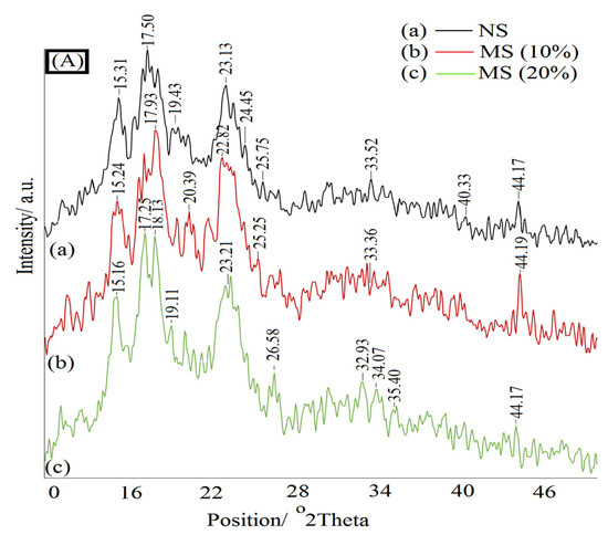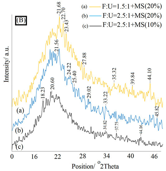 An XRD analysis was performed to investigate the phase structure of the samples during the synthesis and curing, too. The diffractograms of native starch and modified starch are shown in Figure 3A. The XRD pattern of native starch showed prominent diffraction peaks at 2θ values of 15.31°, 17.5°, 19.43°, and 23.13°, which were the characteristic peaks of type A starch [37]. Modified starch oxidized by 10% and 20% NaOCl (MS10% and MS20%) exhibited similar diffraction peaks illustrating that the oxidation mainly occurred in the amorphous region of starch [38]. These findings are consistent with the previously published data [39,40,41,42]. Figure 3B presented the XDR diffractograms of the MS/UF adhesives synthesized by different F:U mole ratios. As could be seen, all of the characteristic peaks of oxidized starch disappeared or were significantly weakened, which revealed the alteration of the crystalline region into an amorphous structure. This verified the conversion of MS and UF into adhesive [42].