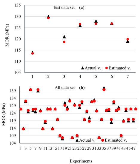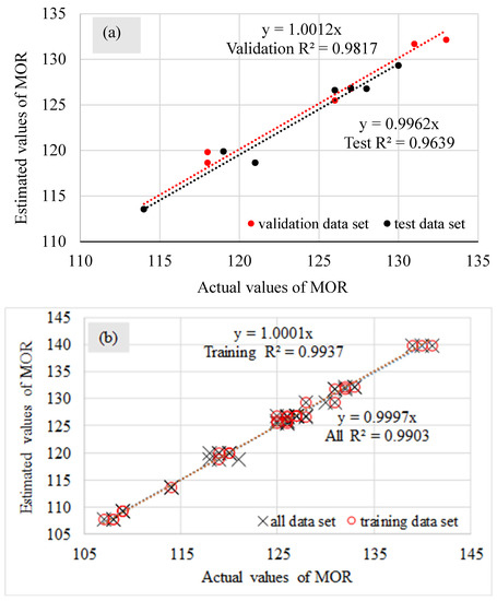 The comparison of the predicted and actual values of the test and all data sets for MOR is presented in Figure 5, graphically. It is observed that the ANN outputs are very close to the actual outputs of MOR. This fact increases the applicability of the designed prediction model. These findings can also show that well-trained ANN models can be used effectively to predict glulam’s MOR in order that the number of tests or the test cost and time decrease.