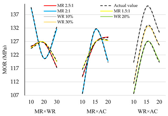 Based on Table 3, the F-value of the quadratic effect of AC (x32) had the highest effect on the response with the highest value (1110) and the quadratic effect of MR (x12), the interaction effects of MR×WR (x1x2) and WR×AC (x2x3) had the lowest effect on the response with the lowest value. However, when applying an average level of MR, the low level WR, and an average level AC, the maximum MOR (140 MPa) was obtained.