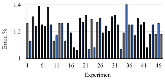 Figure 6 shows the interactive effect of the factors being studied on the MOR at any of the three levels of the independent variable x1 (MR), x2 (WR), and x3 (AC). At the same time, it shows the deviation of the estimated values from the actual values for all three interactive effects x1x2, x1x3, and x2x3. It is observed that there is a rather perfect consistency and overlap between the estimated and experimental values. To show it, the error percentage of the estimated and experimental values is given in Figure 7. It can be seen that the error percentage ranges from 1.06 to 1.4%, which is very low, showing the perfect agreement between the estimated and experimental values.