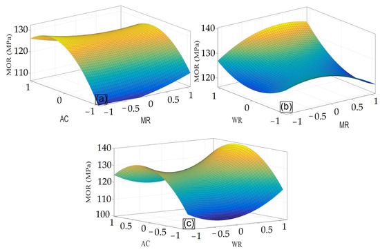 The interactive effect of WR and AC on MOR is shown in Figure 8c. When the bending strength is maximum and MR is at the middle level (2:1), WR (x2) is minimum, and AC (x3) is at the middle level. As WR becomes minimum, a continuity is observed in the MOR decrease. However, as AC decreases or increases beyond the middle level (15%), MOR decreases. This decrease is maximum when the alkali concentration is minimum. Based on the F-value in the ANOVA table, it is observed that the effect of this interaction is minimum (5.32) among all affecting variables.