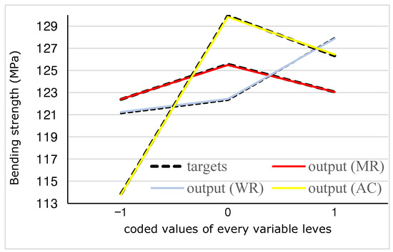 The effect of MR, WR, and AC was examined on the bending strength and was modeled by ANN. Table 2 presents the bending strength values obtained as the result of experimental study together with the estimated values. In addition, the statistical evaluation of the effects of the independent variables was performed on the response being studied by ANOVA (Table 3). This statistical method can determine the difference or similarity between two or more data groups based on the comparison of the average value of the properties being examined. Based on the ANOVA results, the quadratic model was chosen. The effects of the linear parameters WR (x2), AC (x3), interactive parameters MR×WR (x1x2), MR×AC (x1x3), WR×AC (x2x3), and quadratic parameters MR (x12), WR (x22), and AC (x32) on the bending strength were significantly and statistically different with p < 0.05%. Moreover, the non-significance of the lack of fit also shows the fitness of the quadratic model.