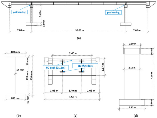 Footbridge geometry: (a) side view, (b) steel girder cross-section (c) deck cross-section (d) pier section.