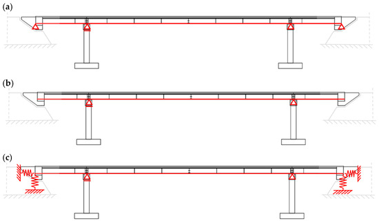 Footbridge structural schematization (red shapes): (a) FIX_Ovhg model (b) FREE_ Ovhg model, in which overhangs do not interact with the ground (c) SPRING_ model with overhangs connected to the ground by springs.