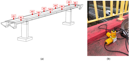 (a) Layout of the measurement points located along the footbridge (point A1–A5, B1–B5); (b) The A1 measurement point equipped with three piezoelectric high sensitivity (10,000 mV/g) accelerometers.