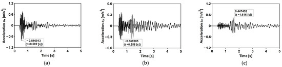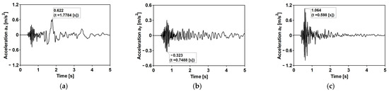 The time history of the registered ground acceleration for the first mining-induced shock: (a) horizontal direction WE; (b) horizontal direction NS; (c) vertical direction Z.