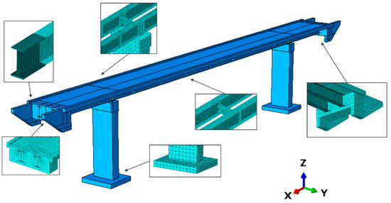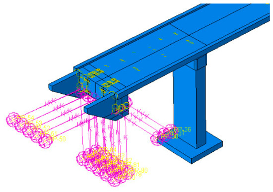 The finite element (FE) elastic model of the footbridge (Figure 11) was implemented in ABAQUS/Standard [36]. The 8-node and 3-node brick finite elements were used to model concrete elements and transverse steel beams, and the steel beams of the girders were modeled by 3-node shell elements. The total number of elements was about 316,000, and the element dimensions were determined based on the convergence analysis, with the first natural frequency value serving as the convergence criterion. Kinematic coupling constraints are given between the bottom of the girders and the top of the pillars based on the different bearing types applied in the structure. Due to efficiency reasons, non-structural elements, such as barriers, even if considered as masses were not considered as structural elements, having negligible influence on the dynamic response.