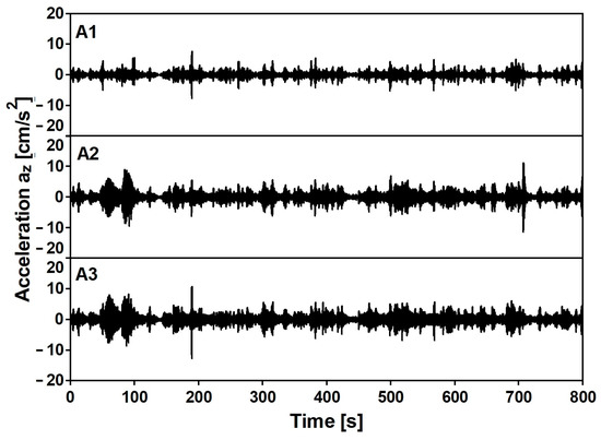 The experimental evaluation of modal parameters of the footbridge was conducted using the Operational Modal Analysis (OMA) techniques [26,27,28,29,30]. Modal identification of the footbridge was realized based on the auto- and cross-correlation function of output-only data collected under in-operation field tests. Signals of registered vibrations generated by chaotic pedestrian movement, heavy road traffic under the footbridge, and wind were processed. The length of the recorded signals was 15 min. Examples of recorded time histories are reported in Figure 13.