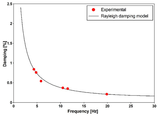 The Rayleigh mass and stiffness proportional damping model was used for the numerical simulations [32]. Based on obtained logarithmic decrements (see Table 3) for the first and fourth modes (both vertical), the coefficients of the Rayleigh damping model were estimated as 0.4548013 for the mass and 0.0000045 for the stiffness proportional damping. The dependence of the damping ratio on the frequency for the determined Rayleigh coefficients along with the damping ratios detected experimentally are portrayed in Figure 16.