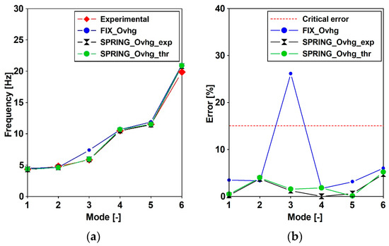 As far as frequencies are concerned (Table 5), the maximum percentage error resulted equal to 4.73% while in average resulted lower than 2%. However, it has been noticed that, as far as the spring theoretical values are concerned, the fitting can be considered satisfactory as well, having averaged value slightly greater than 2% and a maximum value (5.18%) greater but lower than the threshold of 15%. A summary of the resulting errors is reported in Figure 17 were, for the six considered modes, the experimental frequency is compared in terms of frequency values (Figure 17a) and percentage errors (Figure 17b) that for the FIX_Ovhg model clearly exceed the 15% critical value (red line).