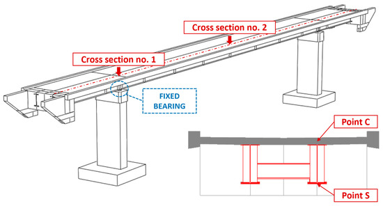 The Time History Analysis (THA) was used for dynamic analyses. The calculations were conducted with the Hilber–Hughes–Taylor time integration algorithm provided in the ABAQUS/Standard software [36]. The experimentally estimated Rayleigh damping coefficients were used according to the damping values reported in Table 3 and Figure 16 (Section 6.1). The results, discussed in the following sections, regard the induced stresses at points C and S (Figure 20), respectively, concerning the upper part of the concrete slab and lower part of the bottom flange. Those points regard the two cross sections number 1 and 2, respectively, located over the pillar and at the middle of the central span. Maximal principal stresses and von Mises stresses were considered, respectively, for concrete slab and steel flange.