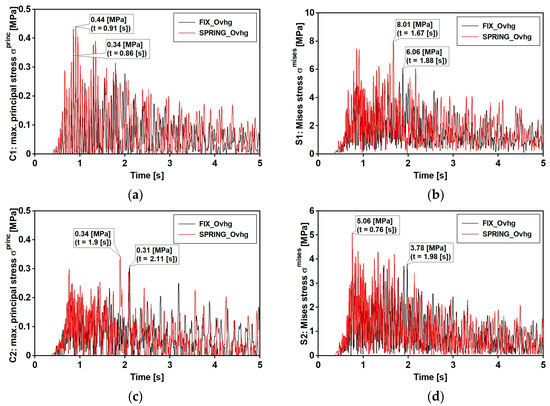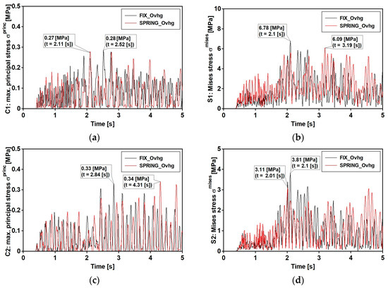 Mining-induced stress [MPa] time histories: event with narrow band spectrum. FIX_Ovhg model (black line) and SPRING_Ovhg model (red line): (a) positive value of principal stresses at points C1 (b) positive value of principal stresses at points C2; (c) the von Mises stresses for points S1; (d) the von Mises stresses for points S2.