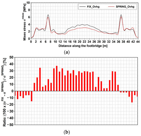 Mining induced stress [MPa] time histories: event with narrow band spectrum; von Mises stress along the span, at the bottom flange: (a) FIX_Ovhg (black line) and SPRING_Ovhg model (red line); (b) percentage error.