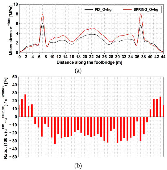For the qualification and quantification of the SSI impact on the dynamic response level, the stresses’ ratio (see Figure 23b and Figure 24b) seems to be the best way of the results’ demonstration. It unquestionably portrays how the type of Fourier spectrum of the excitation affects the level of the dynamic response of the footbridge. The response level is up to 40% higher for the FIX_Ovhg model than for the SPRING_Ovhg one as far as the compact spectrum is concerned. The opposite situation can be noticed for the scattered shock spectrum.