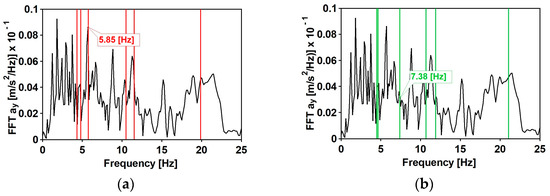 As far as the compact frequency spectrum is concerned, results made visible a beneficial effect of the DSSI. While considering the effect of the scattered frequency spectrum, only the transversal component plays a central role: (1) the third horizontal mode has a frequency of 5.85 Hz (see Table 3 and Figure 15), where the spectrum (see Figure 25a) has the higher value; (2) the third lateral mode of the FIX_Ovhg model has a frequency of 7.38 Hz (see Table 5), where a lower spectral value (see Figure 25b) can be observed.