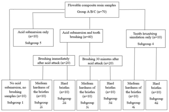 After that, forty samples from each group were subjected to submersion in hydrochloric acid. Ten samples from groups A, B and C were maintained as they resulted after finishing and polishing procedure (subgroup 1) and twenty samples were exposed to a toothbrushing simulation process (subgroups 4i and 4ii).