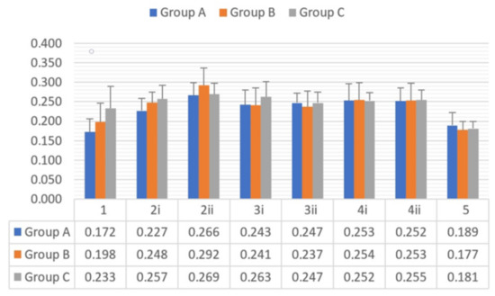 Statistical test results regarding the differences between the subgroups in groups A, B and C are presented in Table 4. In group A, significantly higher Pa values were recorded between subgroup 1 and 2ii (p = 0.003 < 0.05), between subgroups 1 and 3ii (p = 0.039), subgroups 1 and T4i (p = 0.019), subgroups 1 and 4ii (p = 0.021) and between subgroups 5 and 2ii (p = 0.033). In group B, significantly higher Pa values were recorded between subgroups 1 and 2ii (p = 0.024) and subgroups 2ii and 5 (p = 0.002). In group C, significantly higher differences were recorded between subgroups 5 and 2i (p = 0.031), subgroups 5 and 2ii (p = 0.006), subgroups 5 and 3i (p = 0.014) and subgroups 5 and 4ii (p = 0.04).