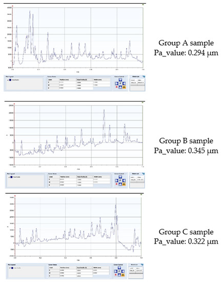 Mean surface roughness values (Pa) and standard deviation in groups and subgroups are presented in Figure 2. Aspects of some profilometric measurements of three samples from groups A, B and C in subgroup 2i are presented in Figure 3. There were no statistically significant differences between groups A, B and C in any of the study subgroups (Table 3).