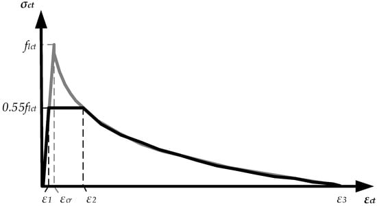 The numerical inverse technique used to derive the constitutive model incorporating the experimental results of reinforced lightweight concrete elements is discussed in detail in references [,,]. The fundamental aspects of physical modelling are described below. The methodology is based on a layered section model, which implies the successive application of direct (curvature prediction) and inverse (constitutive modelling) approaches. The method proposed by Kaklauskas and Ghaboussi [] was applied to the constitutive modelling to obtain the average stress and average strain diagrams for cracked tensile concrete. As a result, tension–stiffening diagrams with eliminated shrinkage [,] were obtained. The proposed model (Figure 1) is approximated as a three-curve diagram. The ascending branch of the curve represents the elastic behaviour of the RC before cracking. Meanwhile, the horizontal and descending branches characterise the stages of crack formation and further development, respectively. The tensile strength is σct = 0.55flct, where flct is the average tensile strength of LWAC calculated according to the Eurocode 2 (EC2) standard [].