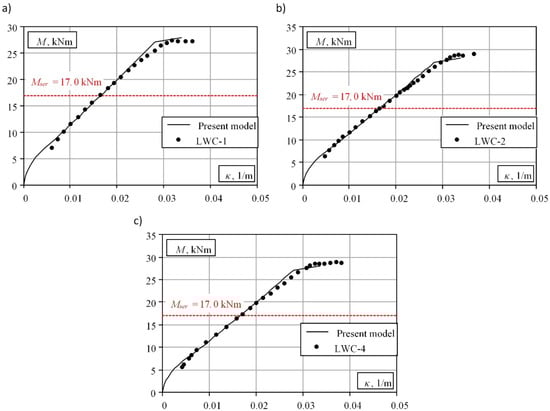 A comparison of the numerical and experimental bending moment–curvature diagrams is shown in Figure 3. The presented comparison shows that the numerical model of reinforced lightweight concrete proposed by the authors is suitable for the deformation analysis of full-scale structures. The theoretical model provides satisfactory prediction results at the stages preceding reinforcement yielding. The maximum discrepancy between the experimental and theoretical deflections at the service load (Mser) does not exceed 2.5%. The analysis of the obtained results shows that the authors’ proposed model can be considered an alternative tool for analysing the real stress–strain state of lightweight RC.